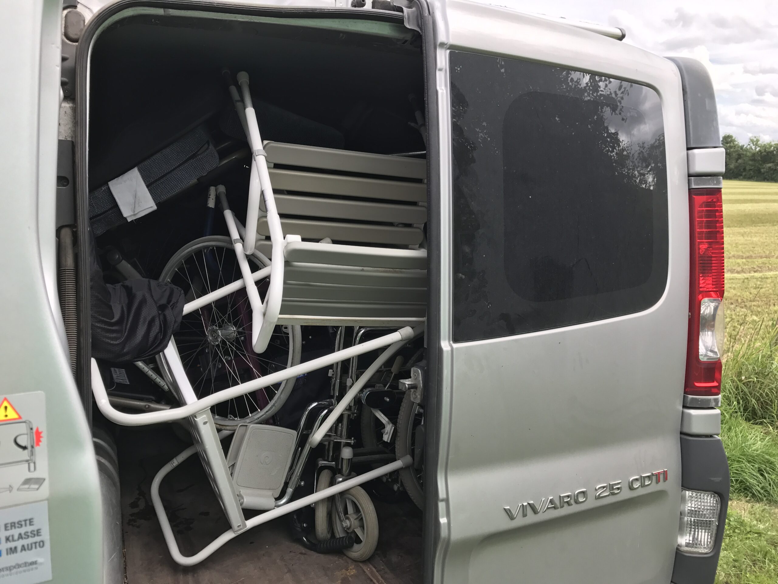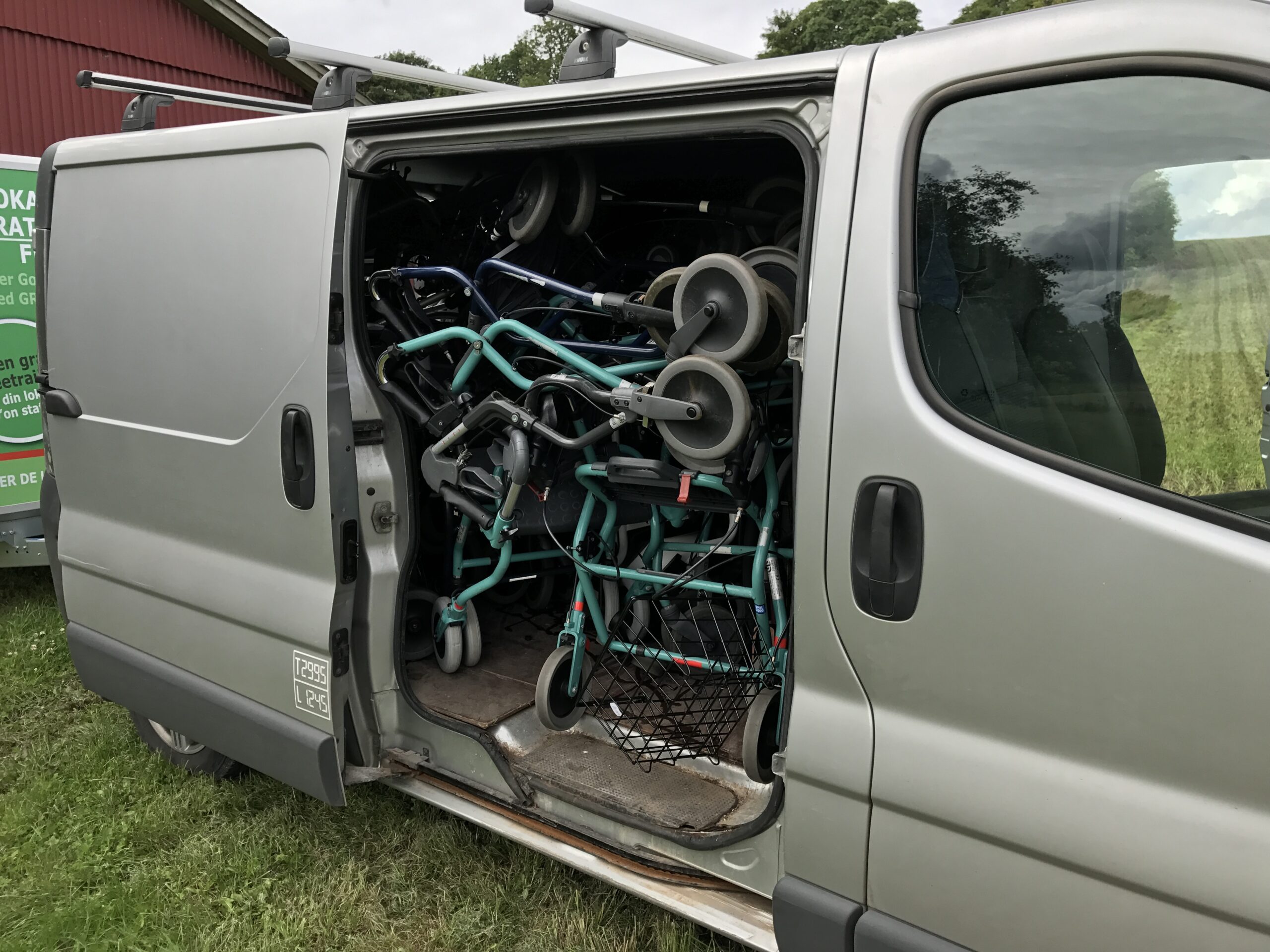 En varevogn og en trailer fyldt med rollatorer, kørestole, hospitalsenge, madrasser mm. blev hentet i dag. De ting skal snart køres til Ukraine.